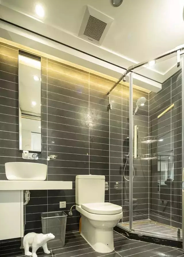 配合排氣扇的通風(fēng)抽濕,沒有窗戶的衛(wèi)生間更應(yīng)該做好干濕分離,讓排氣扇有針對性地排濕抽風(fēng)。用玻璃隔斷將產(chǎn)生水汽的淋浴區(qū)隔開,這樣更有利于抽風(fēng)機(jī)抽走水汽,保持衛(wèi)生間干爽。