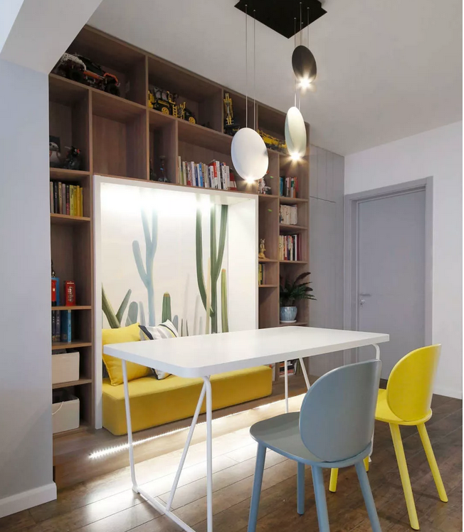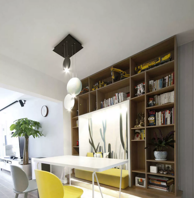 餐廳的位置比較暗,運(yùn)用隱藏式輔助光源改善光感,軟裝采用綠色與黃色做點綴賦予生機(jī)感。墻面的異形置物架又能滿足儲物與展示的需求。