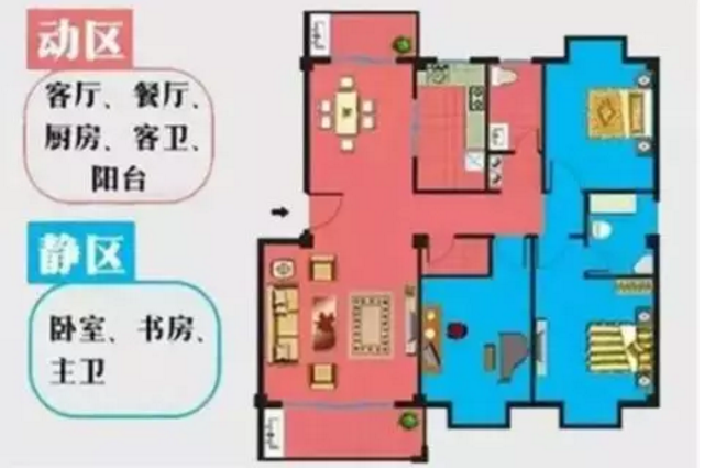 所謂“動(dòng)靜分離”,就是把動(dòng)區(qū)(客廳、廚房、餐廳等)跟靜區(qū)(臥室、書(shū)房等)通過(guò)合理的空間布局給分離開(kāi)來(lái),在動(dòng)區(qū)的活動(dòng)保持的基礎(chǔ)下,又能讓靜區(qū)能夠保持一定的私密性,減少彼此之間的干擾。