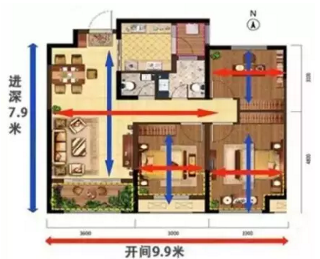 把房子的主要采光面稱(chēng)為開(kāi)間(一般指東西的距離),與其垂直的稱(chēng)為進(jìn)深(一般指南北的距離)。開(kāi)間和進(jìn)深的比例為4:6較為合適,如果開(kāi)間太小,進(jìn)深過(guò)大,會(huì)影響房子的采光,反之則室內(nèi)溫度,濕度不穩(wěn)。