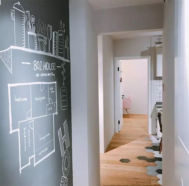 如果家里有小孩的情況,不妨把走廊的大白墻改成黑板墻,給小孩一個(gè)涂涂畫畫的小空間。有了黑板墻,再也不用擔(dān)心大白墻被涂花了。相比大白墻,黑板墻的裝飾效果充滿童趣。