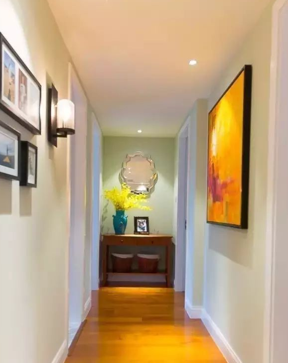 也可以選擇掛上一些自己喜歡的藝術(shù)畫布置走廊墻壁。配合燈光作用,走廊也能變成家里的一道亮麗的風(fēng)景。