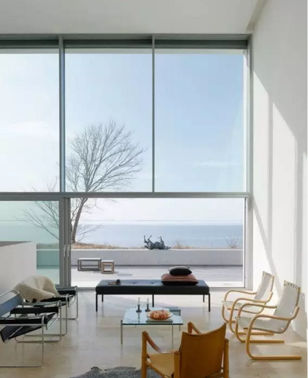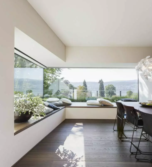 大面積的固定窗也很受歡迎,很好的取到室外的美景,它不僅采光好,而且密封、隔熱性較好,但是不能開啟,只能用在家里的某一部分,因?yàn)樗荒荛_窗換氣。