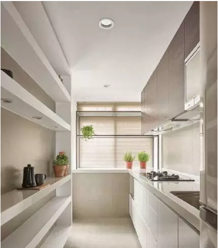 ▲在家也能有餐具展示墻:捨棄封閉柜體,利用大面積開放層架收納兼展示餐瓷,更特別在中間層架裝設(shè)投射燈,運(yùn)用光線襯托餐瓷的氣勢(shì)并營(yíng)造視覺焦點(diǎn);善用窗臺(tái)空間收納小型家電:利用廚房末端的窗臺(tái)空間收納電鍋、烤箱等小家電,可避免壓縮到狹長(zhǎng)型廚房的走道空間,透光佳的玻璃鐵架則保留窗臺(tái)原有的採(cǎi)光與通透性。