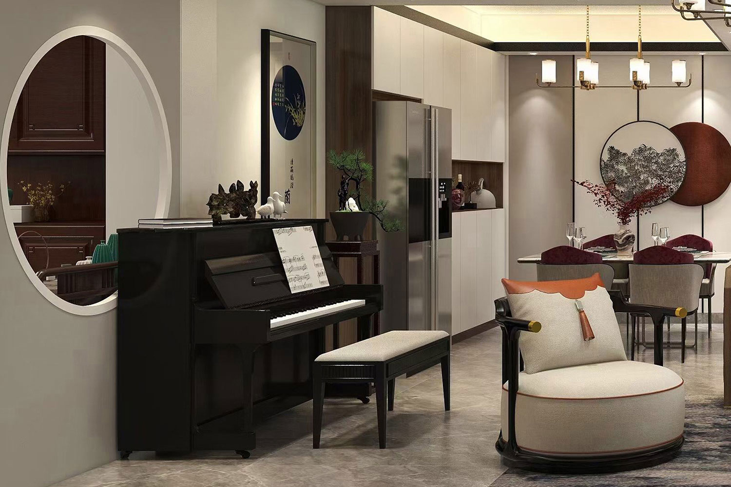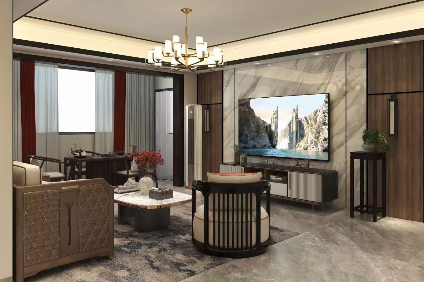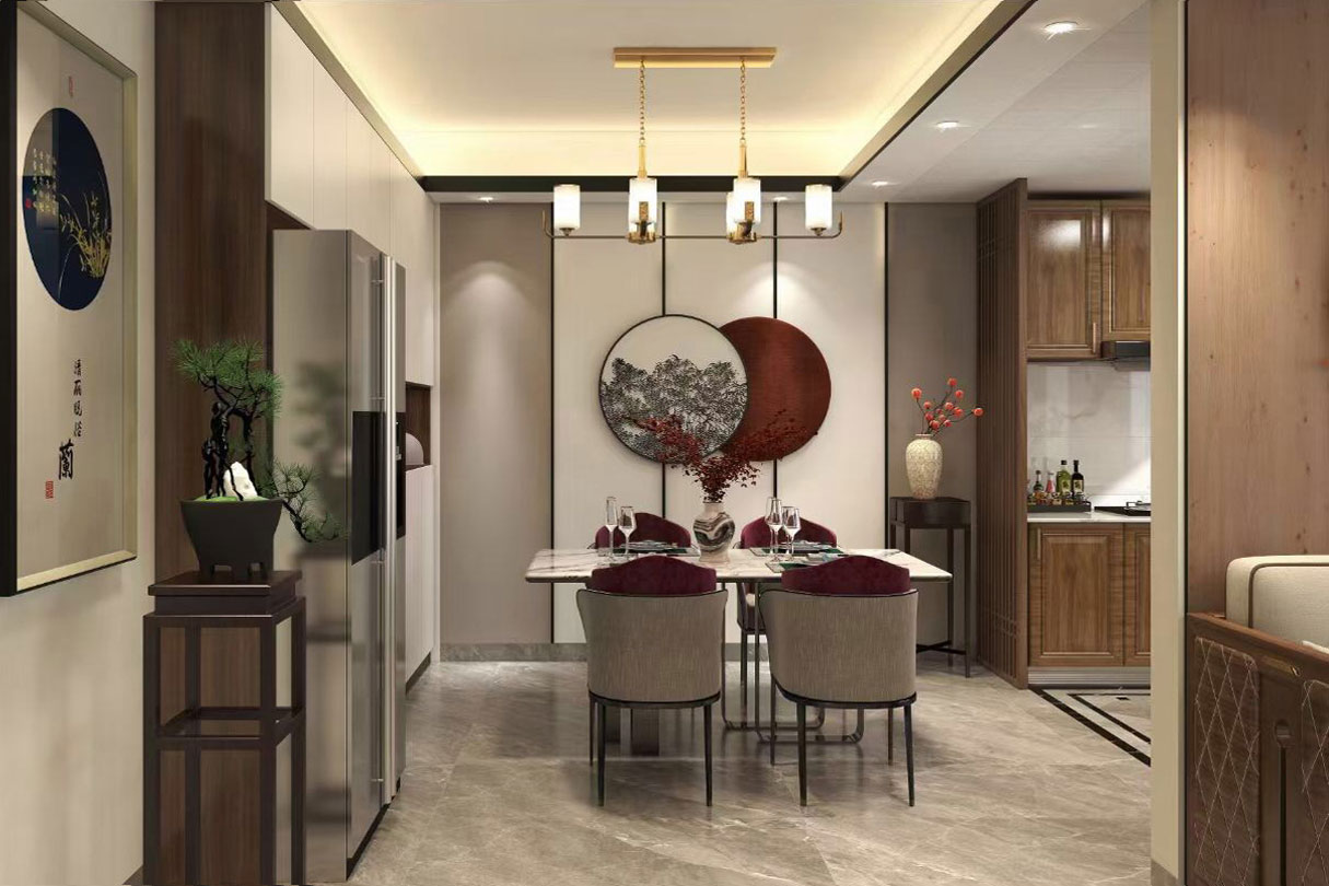 瀏覽量:442天立TT國際258㎡案例,戶型為:四房兩廳兩衛(wèi),屬于新中式風(fēng)格。整體家具陳設(shè)講究對(duì)稱,重視文化意蘊(yùn),整體以深色為主,以古香古色的中式擺件、掛畫來點(diǎn)綴空間,在一些細(xì)節(jié)上勾勒出禪宗的意境。但同時(shí)會(huì)使用現(xiàn)代時(shí)尚元素,比如附帶金屬邊框的桌椅、花瓶,以及背景掛飾等,使整體的家居設(shè)計(jì)中既有中式家居的傳統(tǒng)韻味,又有現(xiàn)代家居的時(shí)尚大氣。