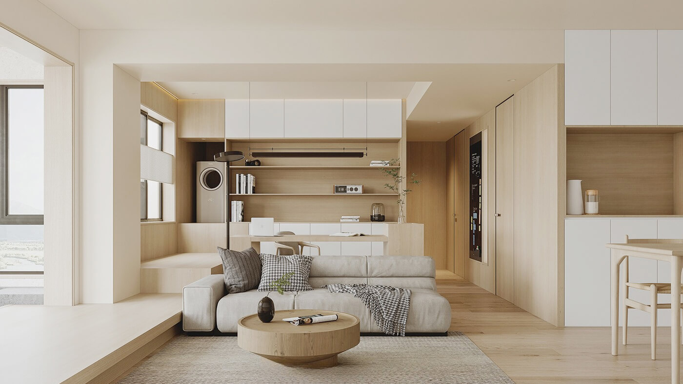該案例采用木質元素,整體呈現(xiàn)簡約效果,空間上將空間極大化利用的設計。日式家居中多采用沉靜溫和的自然色彩,家具的造型線條簡潔,大氣又自然。