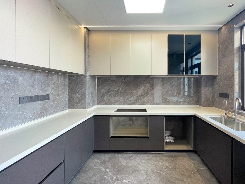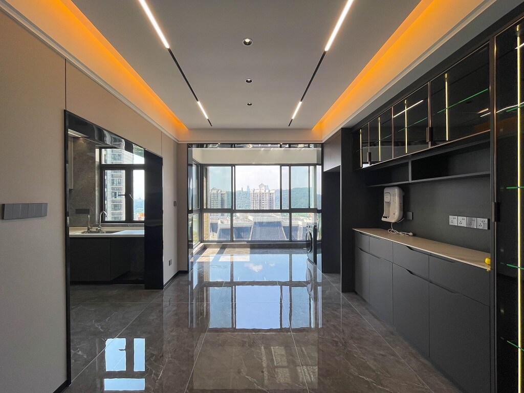 瀏覽量:474整屋采用黑色亮面護(hù)墻板,與全屋通鋪的灰色瓷磚形成和諧統(tǒng)一的整體風(fēng)格,無(wú)主燈的設(shè)計(jì),通過(guò)局部照明和燈帶的巧妙運(yùn)用,營(yíng)造出柔和的光線(xiàn)氛圍。雙眼皮吊頂和兩邊吊頂疊加的設(shè)計(jì),為空間增添一份獨(dú)特的層次感。