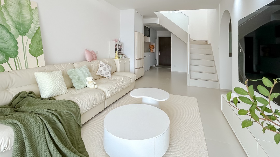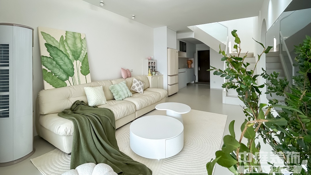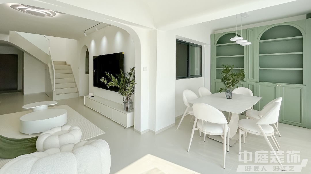 這是一套118㎡的復式住宅,將清新綠與奶油色巧妙融合,營造出一種寧靜而溫馨的氛圍,如夢如幻的浪漫生活由此開始,大面積窗紗將室外光線過濾后傾撒入客廳。