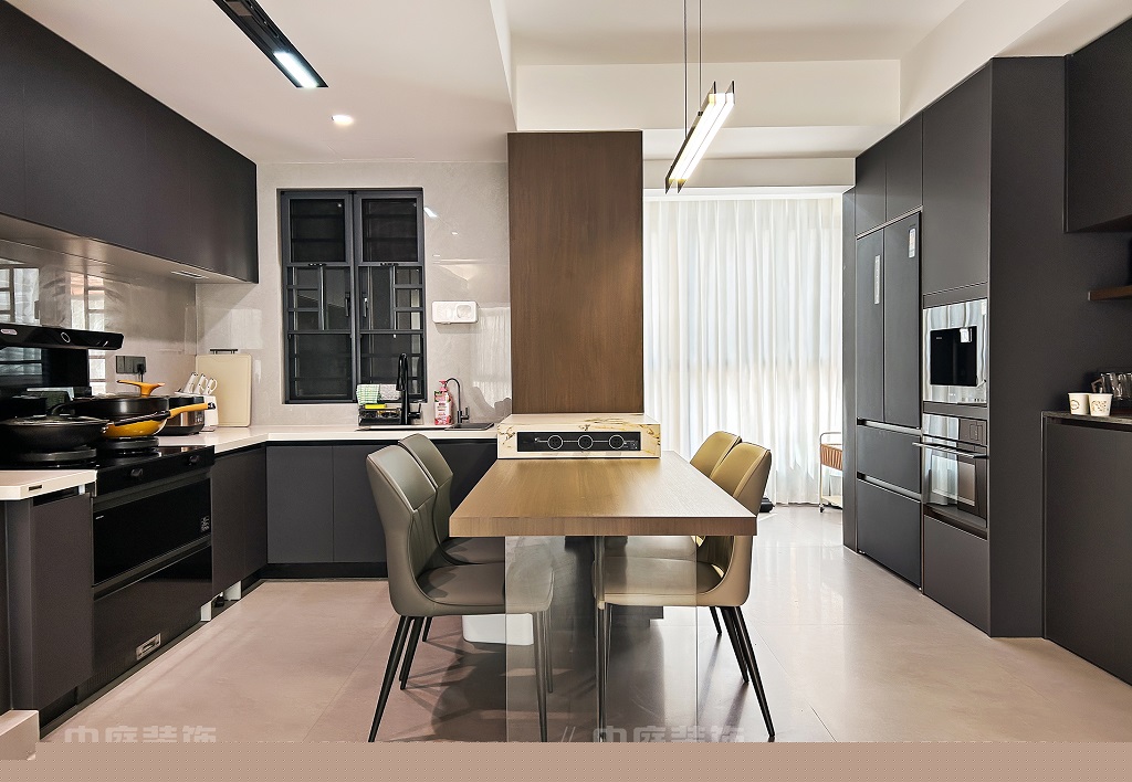 瀏覽量:85客廳以現(xiàn)代黑白灰極簡(jiǎn)風(fēng)格為核心,大面積白紗簾引入自然光線,黑色皮質(zhì)沙發(fā)質(zhì)感高級(jí)。開(kāi)放式布局,深灰櫥柜與木質(zhì)餐桌形成材質(zhì)對(duì)比,線性吊燈提升精致感,功能與美學(xué)兼具,營(yíng)造現(xiàn)代簡(jiǎn)約的烹飪用餐氛圍。輕柔窗簾與柔和燈光,打造靜謐休息空間。精致的材質(zhì)選擇與合理的功能規(guī)劃,詮釋了“少即是多”的現(xiàn)代簡(jiǎn)約居住美學(xué)。
