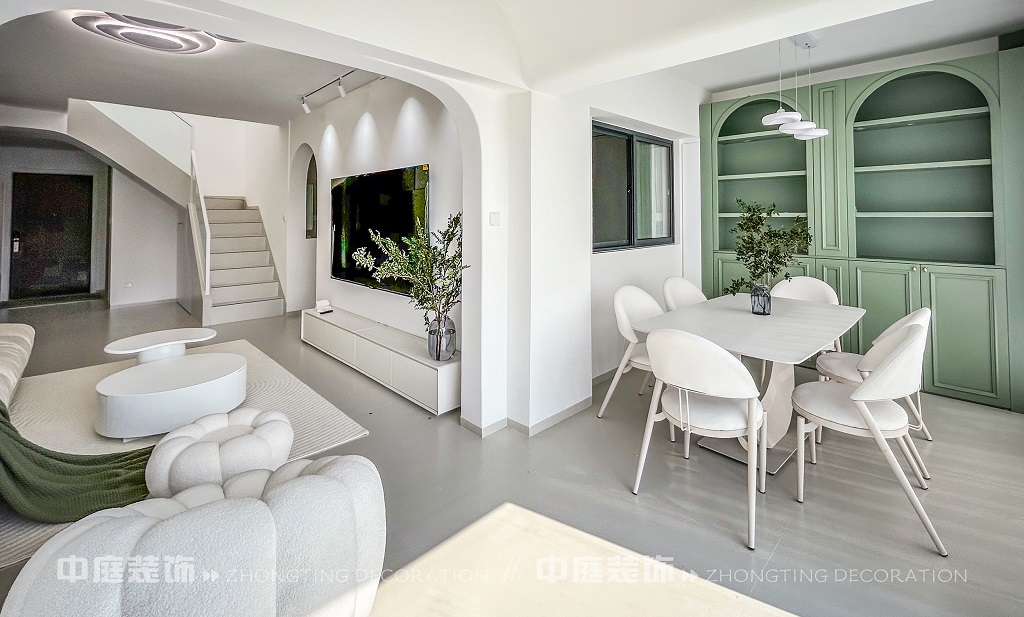 瀏覽量:186這一套綠意盎然的奶油風(fēng)格好似把森林搬進(jìn)了家,軟乎乎的奶白沙發(fā)搭配苔蘚綠毛毯,抱枕選了粉綠撞色,往上面一躺,一天的疲憊都被融化了!圓潤(rùn)的白色組合茶幾,顏值與實(shí)用并存,氛圍感直接拉滿。墻面掛畫(huà)大葉綠植藝術(shù)畫(huà),角落擺放鮮活綠植,將自然綠意融入空間。