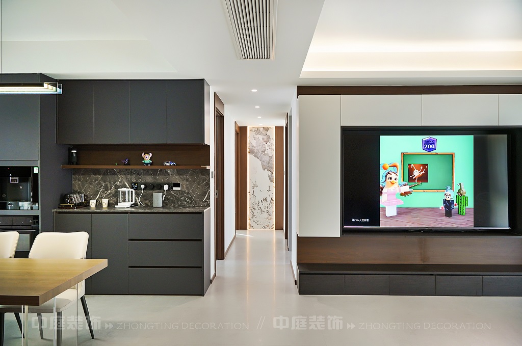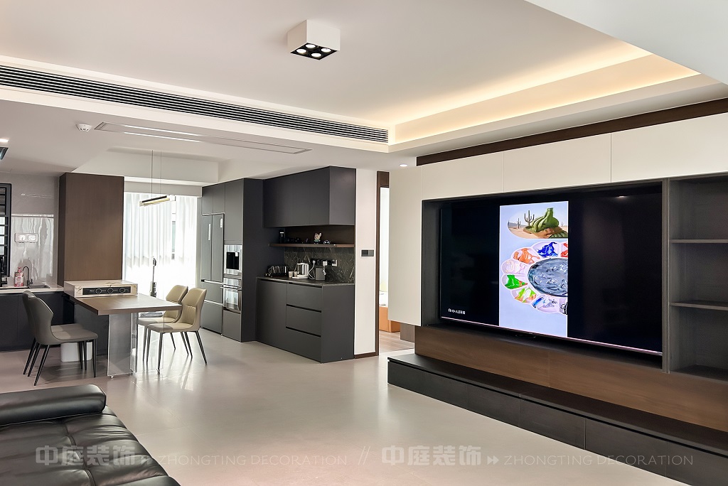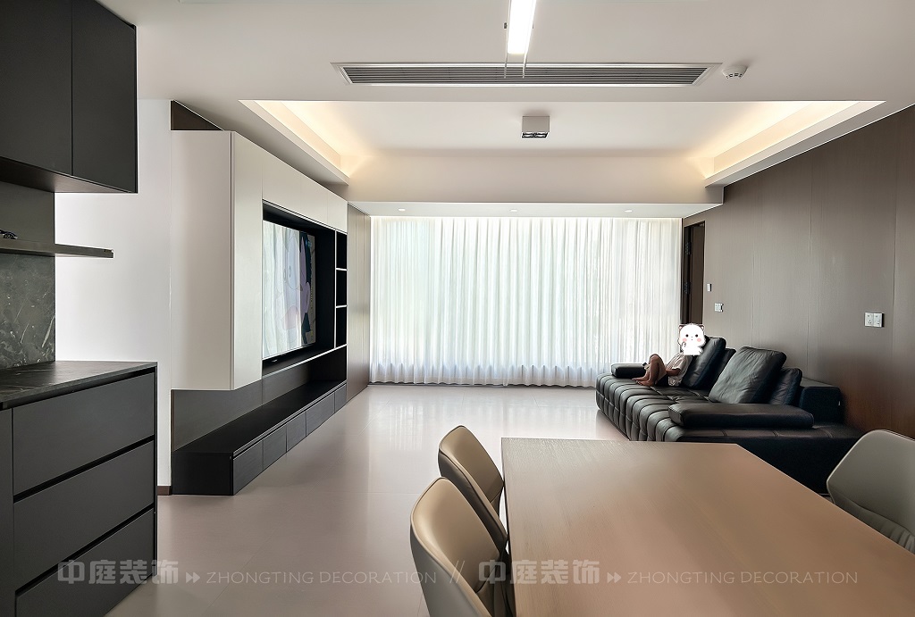 瀏覽量:56客廳以現(xiàn)代黑白灰極簡風(fēng)格為核心,大面積白紗簾引入自然光線,黑色皮質(zhì)沙發(fā)質(zhì)感高級。開放式布局,深灰櫥柜與木質(zhì)餐桌形成材質(zhì)對比,線性吊燈提升精致感,功能與美學(xué)兼具,營造現(xiàn)代簡約的烹飪用餐氛圍。輕柔窗簾與柔和燈光,打造靜謐休息空間。精致的材質(zhì)選擇與合理的功能規(guī)劃,詮釋了“少即是多”的現(xiàn)代簡約居住美學(xué)。