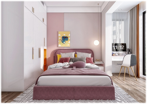 公主房主體以粉色輔以大面積留白,主體粉色吸引目光美麗溫馨,而充滿樂趣,大面積白色代表純潔,充分表現(xiàn)了少女的甜蜜純潔,在此之中輔以橙色在美麗中又不缺活潑,一點點灰色豐富整個畫面感帶有端莊,房間陽臺外擴,充分利用空間開闊明亮。