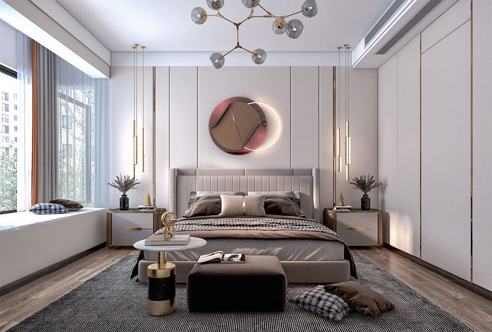主臥延續(xù)了空間整象牙白和駝色與金屬線條裝飾的搭配,這剛好合適的搭配,剛剛好透露出了合適的高貴與優(yōu)雅。
