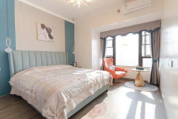 主臥的套房設(shè)計(jì),主臥,衣帽間,書(shū)房一體化可以給業(yè)主更強(qiáng)的居住獨(dú)立性以及舒適感。整體延續(xù)了客廳的風(fēng)格,白色與綠色之間的碰撞,與客廳互相呼應(yīng),橙色的懶人椅作為整個(gè)空間的點(diǎn)綴色。照明以主燈加上床兩側(cè)的吊燈做陪襯,讓整個(gè)空間顯得很有層次更有情調(diào)。