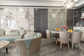 客餐廳采取一體化的設(shè)計(jì),通透寬敞視覺(jué)增加了整體空間的層次感,餐廳背景墻與客廳采用不同色調(diào)以及材質(zhì)的家具予以區(qū)分與以協(xié)調(diào),達(dá)成相輔相成之美。上方的蜿蜒燈盞猶如熱帶叢林的藤曼,座椅的顏色同色系著客廳的色彩,設(shè)計(jì)師得心應(yīng)手以材料與色彩營(yíng)造空間氛圍。