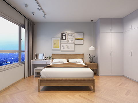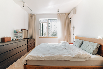 主臥整體用色與風格延續(xù)整體原木色系,木地板配木色家具,色調(diào)素雅,加上簡潔而現(xiàn)代的軟裝陳設(shè),白色的棉麻窗簾讓室內(nèi)的氣氛柔和而溫馨