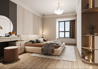 竹炭飾面護(hù)墻板做背景,是大空間設(shè)計元素在小空間的延續(xù)。主臥沒有做過多的造型,大量留白,通過軟裝設(shè)計師的巧手來營造氛圍,利用不同色系與材質(zhì)對比組合形成精致豐盈的裝飾效果,風(fēng)吹簾動,琉光行云,主臥釋放著樂且晏如的溫柔情緒