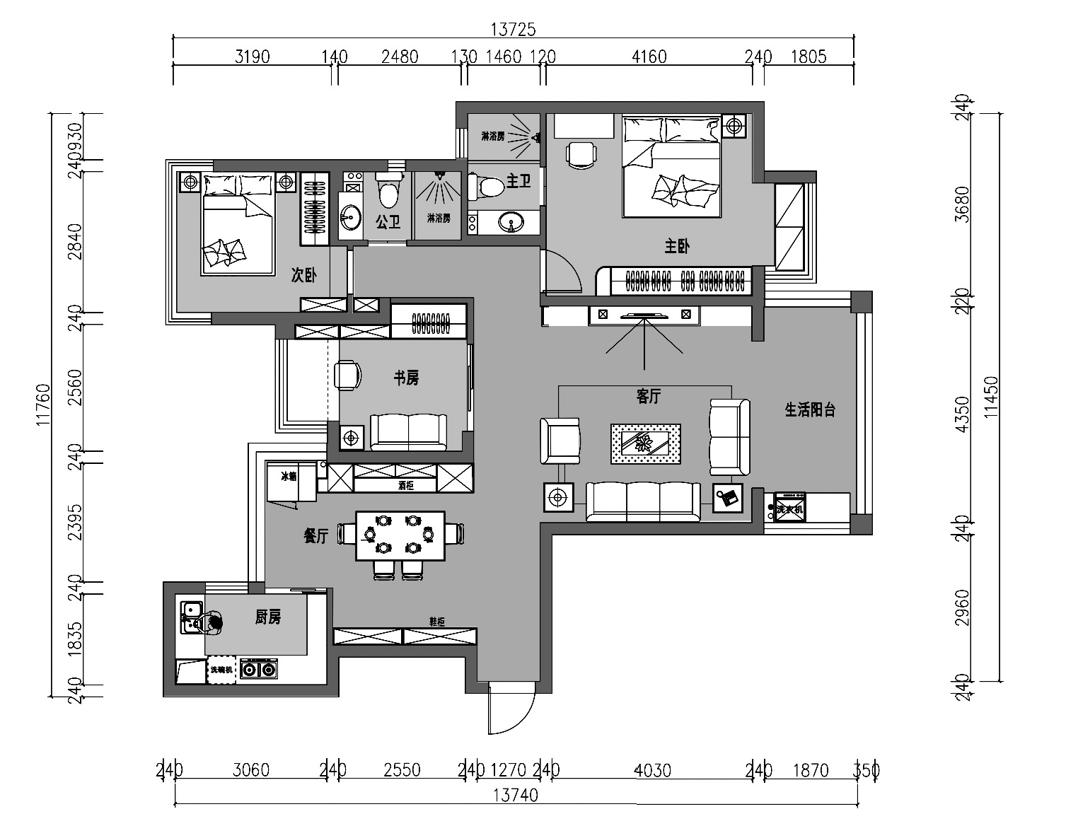 1、改變書房的開啟方向,面朝客廳,實現(xiàn)客廳及書房的南北通透。補(bǔ)充客廳的采光,實現(xiàn)活動及私人空間的分區(qū)更加明朗。